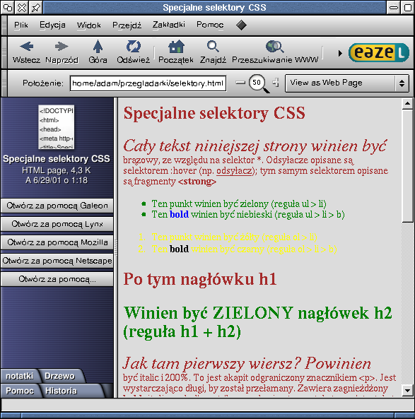 Oparty na Mozilli Nautilus (tutaj jeszcze pod banderą firmy Eazel) nie ma problemów ze specjalnymi selektorami CSS.