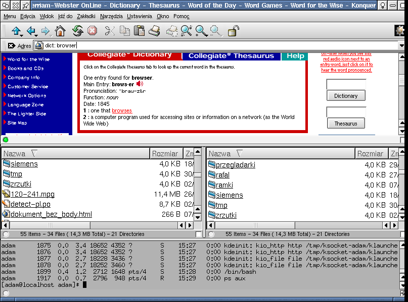 Tak -- to wszystko to tylko jedna aplikacja, Konqueror. Jednocześnie wyświetla stronę, służy jako menadżer plików oraz emuluje terminal.