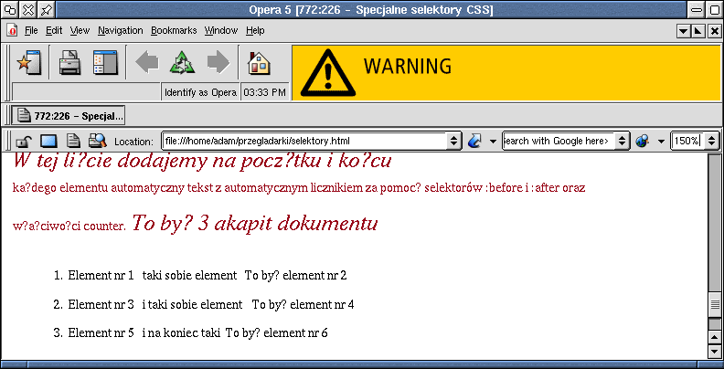 powinna sprawić, że przed i po każdym elemencie listy uporządkowanej znajdzie się odpowiedni tekst z kolejnym numerem. Tę konstrukcję, pozwalającą także np. automatycznie numerować kolejne akapity czy ilustracje, obsługuje tylko Opera w najnowszej wersji (ostatnia beta zawieszała się po napotkaniu tego zapisu).